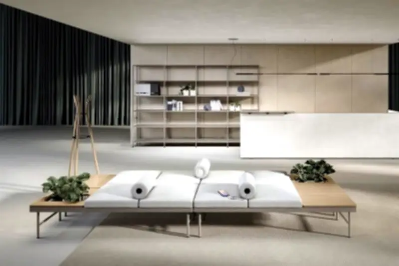 El sofá cuenta con una estructura de módulos ondulantes que se ajustan automáticamente a la presión ejercida por el usuario. Esto permite una distribución uniforme del peso, reduciendo los puntos de presión y mejorando la circulación sanguínea durante el descanso. El sistema está compuesto por resortes inteligentes y espuma viscoelástica de alta densidad.
