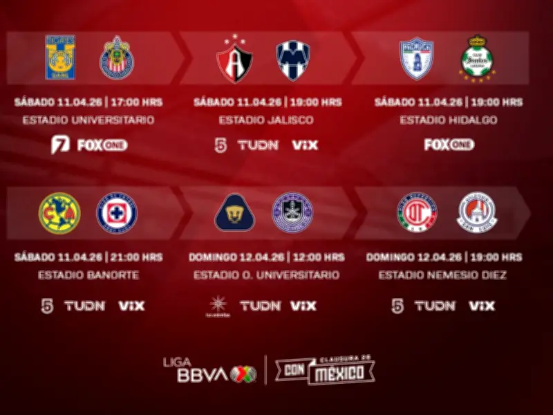 - Sábado 11 de abril: Tigres vs Chivas (17:00 h). Los subcampeones reciben a los líderes, que buscan asegurar el primer lugar.