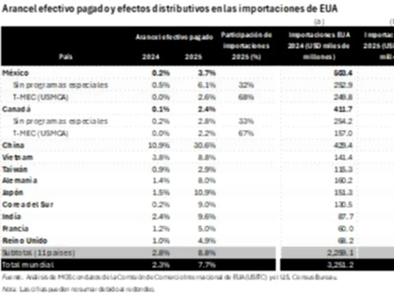 En otras palabras, los aranceles no frenaron la demanda interna estadounidense, pero sí obligaron a las empresas a replantear radicalmente sus estrategias de abastecimiento y la organización de sus cadenas de suministro globales. El resultado ha sido una redistribución clara y evidente del comercio entre países. China, como principal objetivo declarado de la política arancelaria trumpista, emerge como el gran perdedor de este proceso: enfrentó un aumento dramático en sus aranceles efectivos, que saltaron del 10.9% al 30.6%, y sufrió una caída aproximada de USD 129.8 mil millones en sus exportaciones hacia el mercado estadounidense.