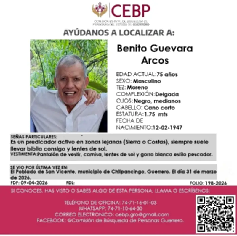 Se trata de Benito Guevara Arcos, un hombre de 75 años originario de la comunidad El Ocotito. Según el reporte de la Comisión Estatal de Búsqueda de Personas (CEBP), fue visto por última vez el martes 31 de marzo en el poblado de San Vicente, municipio de Chilpancingo, donde acudió a predicar como parte de sus actividades religiosas habituales.